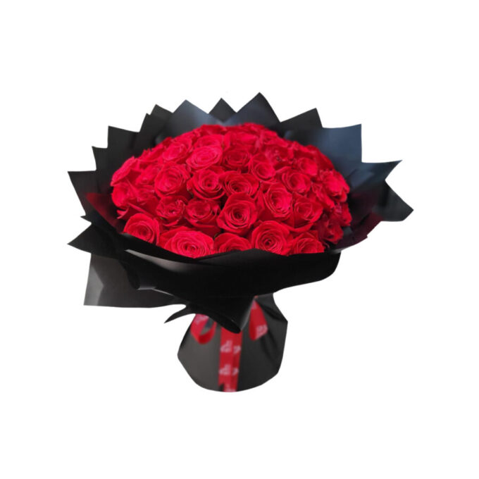 Bold, breathtaking, and irresistibly romantic — the 50 Red Roses Bouquet is a powerful symbol of love and passion. This exquisite arrangement features 50 hand-picked, velvety red roses artfully wrapped in sleek black paper, creating a striking contrast that exudes luxury and sophistication.