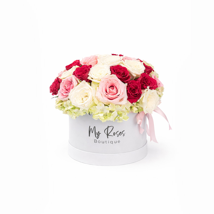 This luxurious composition features a stunning blend of fresh red, blush pink, and creamy white roses, beautifully arranged in a signature white hat box. Soft hydrangea accents add volume and texture, while a delicate satin ribbon completes the sophisticated presentation.