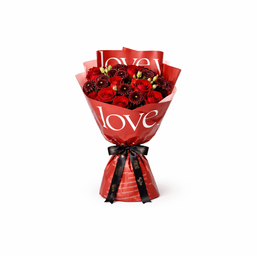 Deep, passionate, and visually striking — Ruby Romance Bouquet blends premium red roses with rich burgundy chrysanthemums in a bold love-themed wrap. The dramatic contrast of velvety reds and the refined black ribbon creates a bouquet that feels luxurious, expressive, and unforgettable.