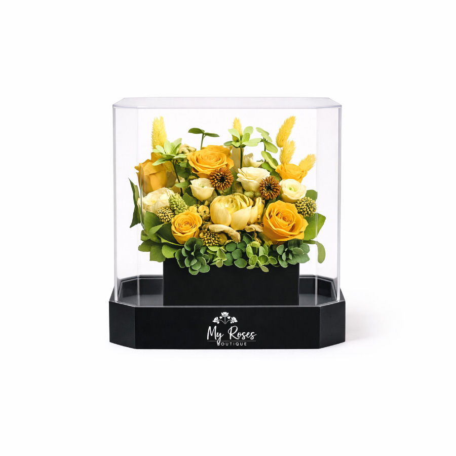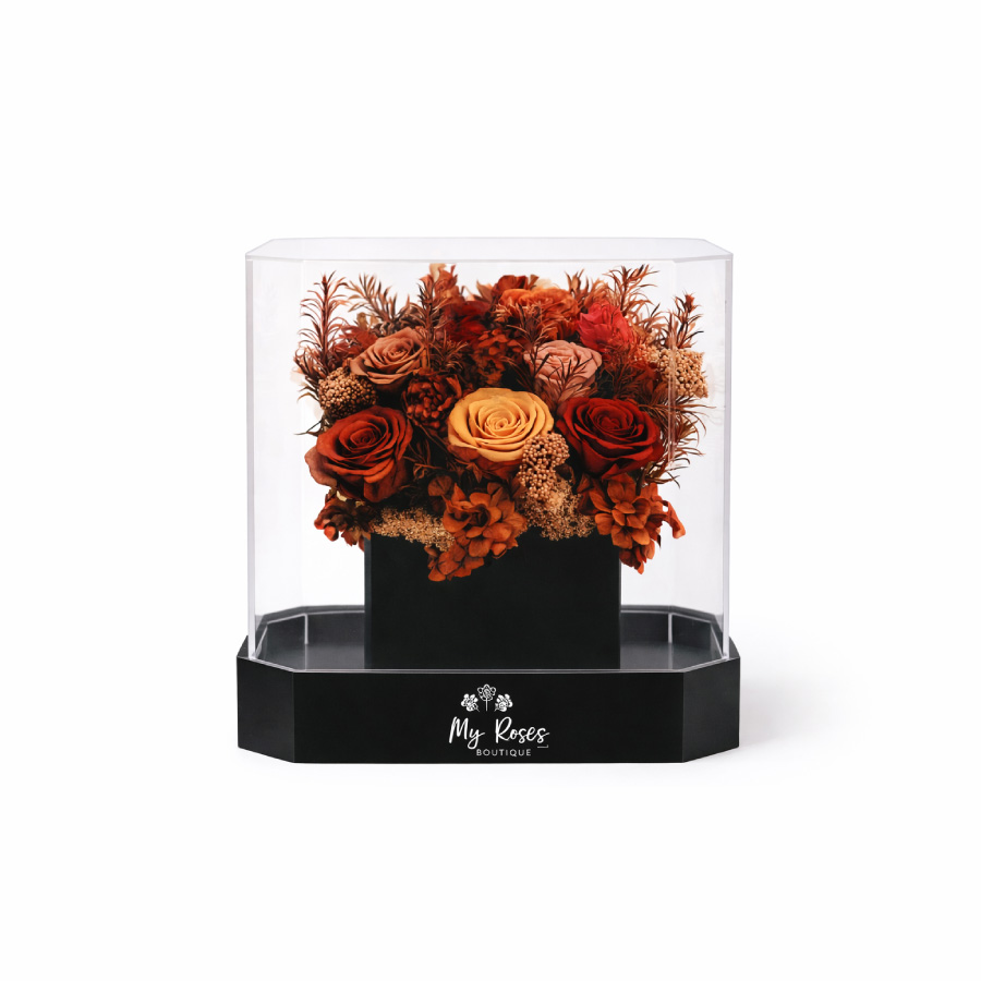 Elegant, timeless, and designed to last — Preserve Flower Garden Box Decoration (Red – Yellow & Beige) is a premium floral décor piece crafted from real preserved roses and botanicals, beautifully arranged inside a crystal-clear acrylic display case on a sleek black base.