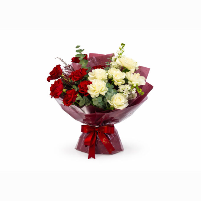 A graceful hand-tied bouquet featuring passionate red roses paired with soft white roses and fresh eucalyptus, wrapped in elegant maroon paper and finished with a rich red ribbon. This bouquet blends romance and purity, making it a timeless gift for heartfelt occasions and meaningful celebrations.