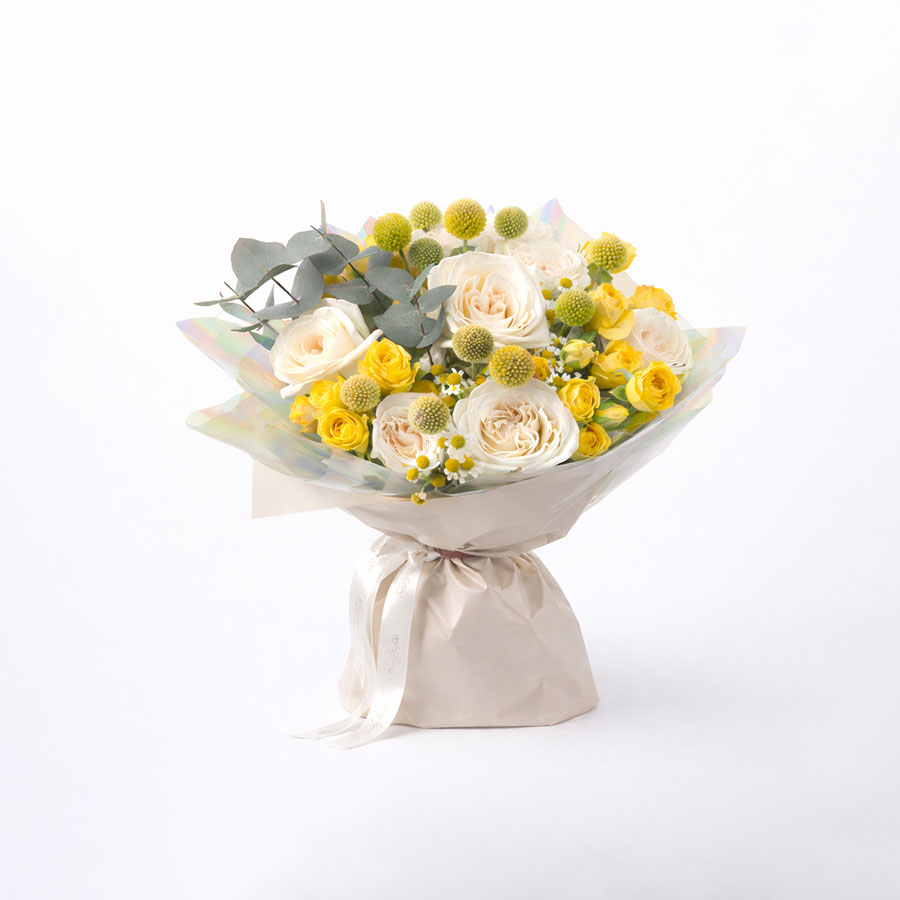 This charming arrangement features elegant ivory roses paired with cheerful yellow spray roses, playful craspedia (billy balls), delicate chamomile blooms, and soft eucalyptus foliage. Wrapped in premium layered paper and finished with a refined satin ribbon, it creates a bright yet sophisticated presentation.