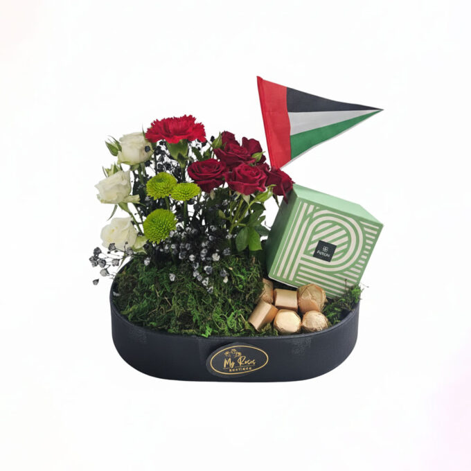 Celebrate unity, pride, and meaningful moments with our UAE Flag Day Arrangement with Patchi Chocolate Arrangement a vibrant display of fresh red roses, white blooms, green chrysanthemums, and black baby’s breath, thoughtfully paired with luxurious Patchi chocolates. Accented with lush greenery and finished with the UAE flag, this arrangement is a striking tribute to heritage, celebration, and elegant gifting. Perfect for UAE National Day, corporate gifting, and patriotic occasions.